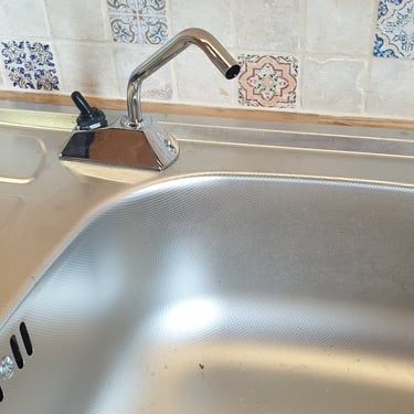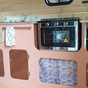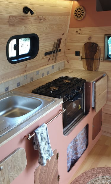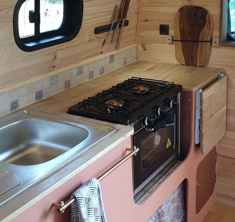 Un coin cuisine équipé d'un évier, d'un robinet, d'une cuve de 40L pour les eaux claires et 40L pour les eaux grises, d'une gazinière et d'un plan de travail spacieux