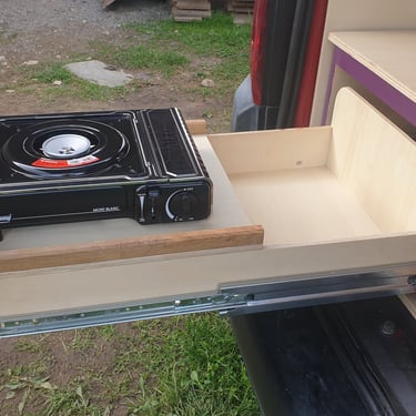 Pour la kitchenette, elle est astucieusement intégrée dans un grand tiroir qui se déploie lorsque le hayon est ouvert.
