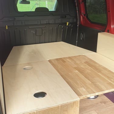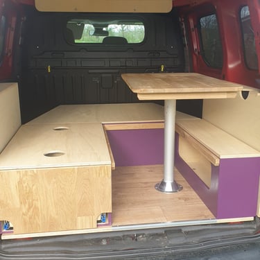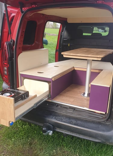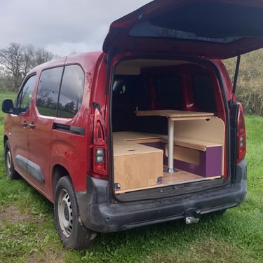 Pourquoi un défi ? Selon le cahier des charges, il me fallait concevoir un aménagement entièrement amovible (habillage inclus), une zone de couchage convertible en banquette avec table, ainsi qu'une kitchenette... tout cela dans un Berlingo !