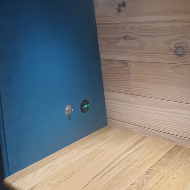 Ce fourgon coloré a été spécialement conçu pour une cliente potière. Son objectif : disposer d'un espace pour ranger son stand et ses poteries lors de ses déplacements sur les marchés, tout en bénéficiant d'une seconde petite maison nomade.